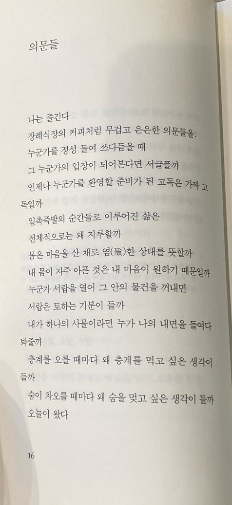 의문들이라는 제목의 시. 의문이 드는 것과 의문을 품는 것. 같은 듯 다른 이 말에 대해 생각했다. 어쩌면 그 의문들의 순간에서 느끼는 것들이 시가 되는 걸까 생각했다. 아직 시는 내게서 너무 멀게만 느껴진다.
