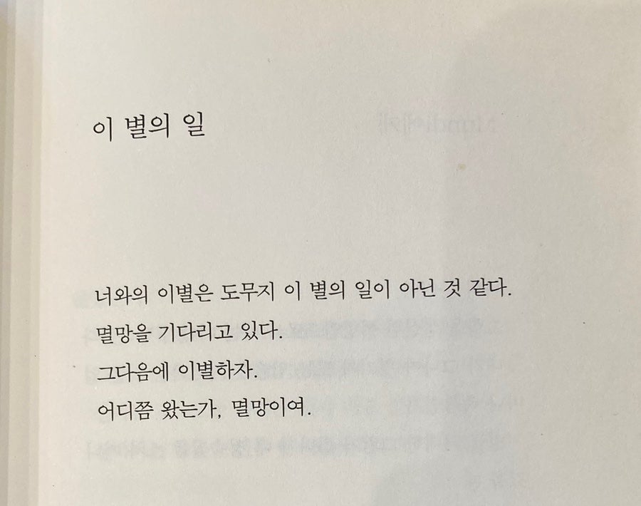 1장은 들이고 2장은 둘인데 2장의 첫 번째 시가 좋았다. 너와의 이별이 이 별의 일이 아닌 것 같다는 말 말이다. 최근에 싱어게인을 통해 들었던 노래가 떠오르기도 했다.