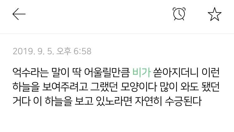 그때는 2019년의 어느 날이었다. 여름이 지나고 가을이 시작되고 있었지만 비가 여전히 많이 내리고 있던 때로 기억한다. 지구의 날씨뿐만 아니라 나 개인의 삶도 그다지 녹록지 않았었다. (그렇다고 지금은 편안하다는 뜻은 아니지만) 그때는 내 삶이 너무 무겁다고 느끼고 있던 순간이었다. 비가 정말 억수같이 쏟아지던 때에 불평을 하며 길을 걸었었다. 우산을 쓰고 있었지만 온몸이 젖을 정도였다. 그리고 비가 그치고 난 후의 하늘을 보며 깨달았다. 이걸 보려고 내가 그토록 많은 일을 겪었구나. 사진은 내 기억 속 모습보다 덜 아름답지만, 그때의 그 순간을 메모장에도 기록해 두고 힘들 때 보고는 한다.
